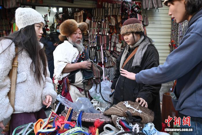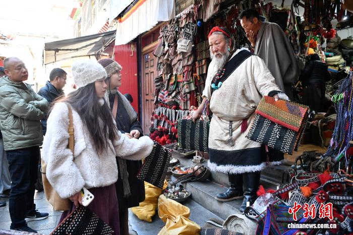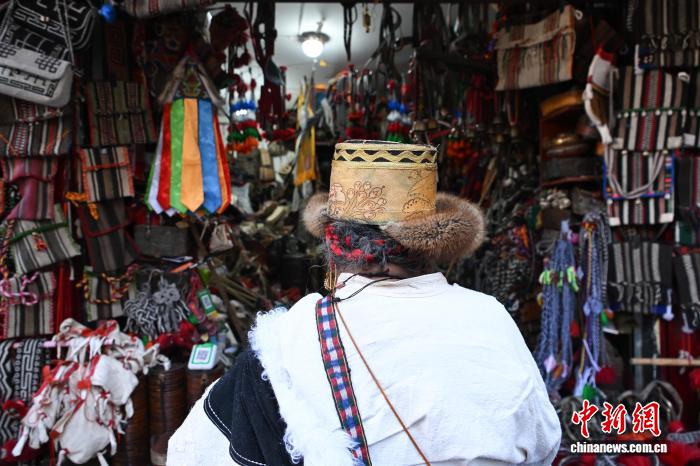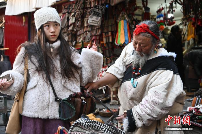 12月9日,西藏拉薩市八廓街沖賽康旁的背陰巷口,55歲店主次仁羅布的藏式老物件小店熱鬧非凡。不足30平方米的空間里,烏朵、馬包、藏式氆氌側(cè)掛包等好物琳瑯滿目,既有時光沉淀的老物件,也有手藝人新制精品。小店吸引本地民眾、年輕人及游客紛紛選購,生意紅火。圖為游客選購藏式氆氌側(cè)掛包。中新社記者 貢嘎來松 攝