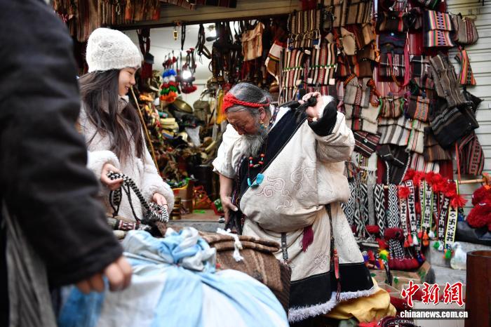 圖為藏式老物件店主次仁羅布給游客推薦藏式氆氌側(cè)掛包。中新社記者 貢嘎來松 攝