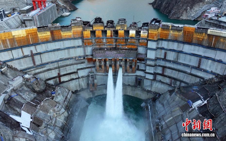 12月27日,中國在建海拔最高雙曲拱壩電站——葉巴灘水電站首批機組正式投產(chǎn)發(fā)電。葉巴灘水電站位于四川省甘孜州白玉縣與西藏自治區(qū)貢覺縣交界的金沙江干流上。水電站總裝機容量224萬千瓦,此次首批投產(chǎn)發(fā)電的機組為4號和3號機組。圖為12月26日,航拍葉巴灘水電站外景。(無人機照片)中新社記者 王磊 攝