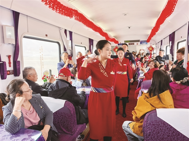 針對高原旅游特殊性及“銀發(fā)族”為主的客群特點,中國鐵路青藏集團(tuán)有限公司持續(xù)升級服務(wù)保障體系,讓旅途兼具安全性與舒適度。車輛方面,該公司完成適老化與舒適化改造,打造2組普惠型旅游專用車組,入藏專列均采用全列有氧臥鋪車廂,配備彌散式供氧系統(tǒng)、專用發(fā)電車及精品餐車,有效緩解旅客高原反應(yīng)。服務(wù)方面,該公司組建“導(dǎo)游+乘務(wù)+醫(yī)護(hù)”三位一體復(fù)合型服務(wù)團(tuán)隊,全程提供健康監(jiān)測、文化講解、應(yīng)急保障等全流程陪伴服務(wù);車廂內(nèi)以民族紋飾、剪紙窗花營造地域氛圍,文藝小分隊沿途獻(xiàn)上藏族歌曲、舞蹈等特色表演,餐車則供應(yīng)烤羊腿、牦牛酸奶、特色奶茶等地方風(fēng)味美食,讓旅程更加舒適美好。運營模式上,該公司采用“晚上開行、白天游玩、邊走邊?!钡脑O(shè)計,途經(jīng)玉珠峰、沱沱河、羌塘草原等高原奇景,在海拔5072米的唐古拉站、措那湖等標(biāo)志性地點定點???,讓游客在休息中跨越山海,充分領(lǐng)略雪域風(fēng)光。同時,該公司強(qiáng)化公鐵聯(lián)運與景區(qū)接駁,推出“旅游小管家”一站式服務(wù),確保游客“行得順暢、吃得地道、玩得盡興”。