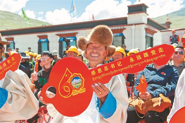 2025年8月15日,定日地震災(zāi)后恢復重建首批民房入住儀式現(xiàn)場,群眾代表拿到新居“鑰匙”。西藏日報記者 旦增嘎瓦 攝