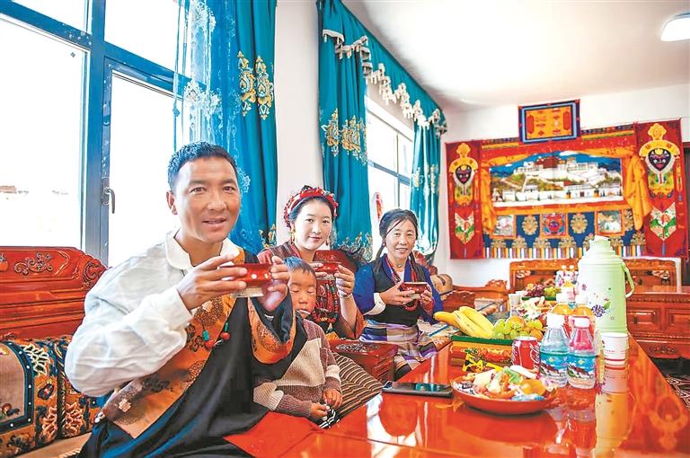 定結(jié)縣乃村村民在喝新房里的第一杯酥油茶。西藏日報記者 旦增嘎瓦 攝