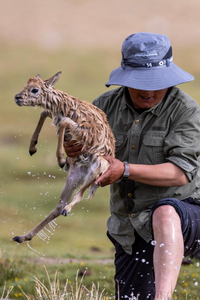 管護(hù)隊(duì)員次旺在救助一只被急流沖走的藏羚羊幼崽(2025年7月14日攝)。