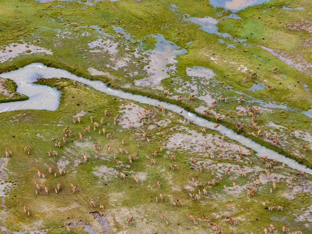 每年7月,在羌塘深處產(chǎn)仔區(qū)域出生的藏羚羊幼崽,都要跟隨母羊遷徙回原棲息地。大群藏羚羊齊聚森隆藏布河西岸,陸續(xù)過(guò)河,場(chǎng)面蔚為壯觀,時(shí)間可持續(xù)一周。
