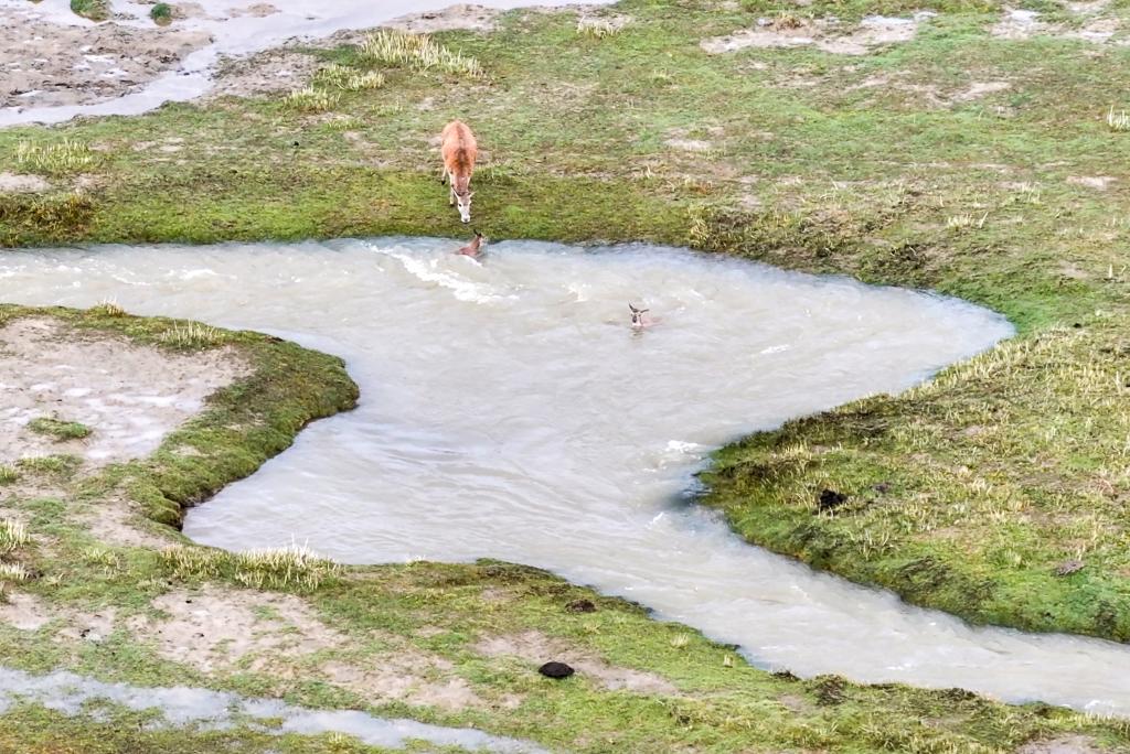 從管理站出發(fā),在沒(méi)有路的草原上行駛50公里,到了海拔5300多米,遠(yuǎn)遠(yuǎn)就看到了森隆藏布河。車剛剛停下,我看到前面一輛車子的駕駛員次旺跳下車就向河邊飛奔。他邊跑邊踢掉鞋襪,到了河邊又挽起褲腳,撲通一聲跳了下去,撈起一頭隨急流浮沉的藏羚羊幼崽。