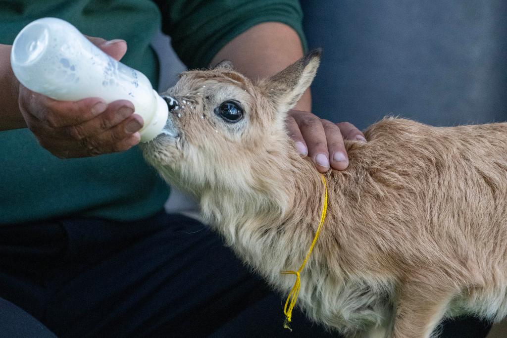 措羅木管理站站長(zhǎng)阿旺洛卓在給藏羚羊幼崽喂奶(2025年7月16日攝)。