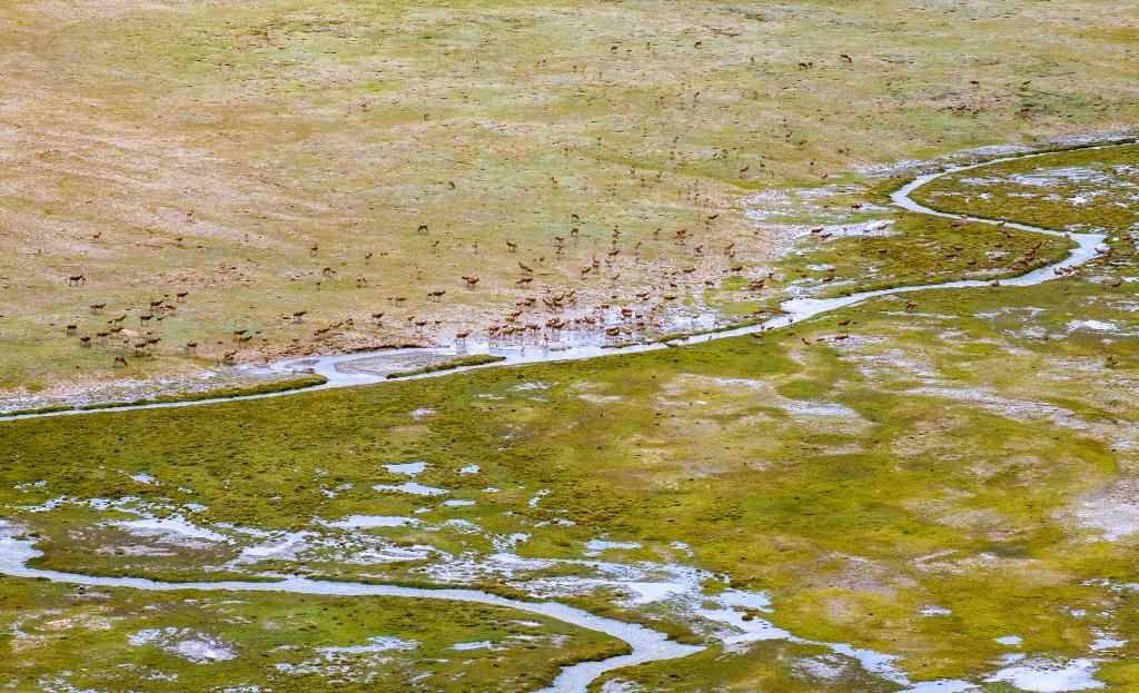 雪山腳下的草原上,一群帶著幼崽的藏羚羊聚集在森隆藏布河西岸準(zhǔn)備過(guò)河(2025年7月15日攝)。