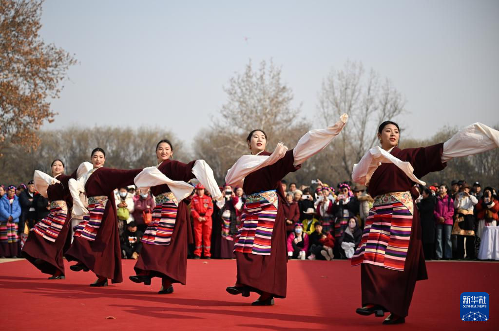 1月17日,來(lái)自西藏自治區(qū)昌都市基層文藝團(tuán)體的演員在西安大明宮國(guó)家遺址公園表演舞蹈。