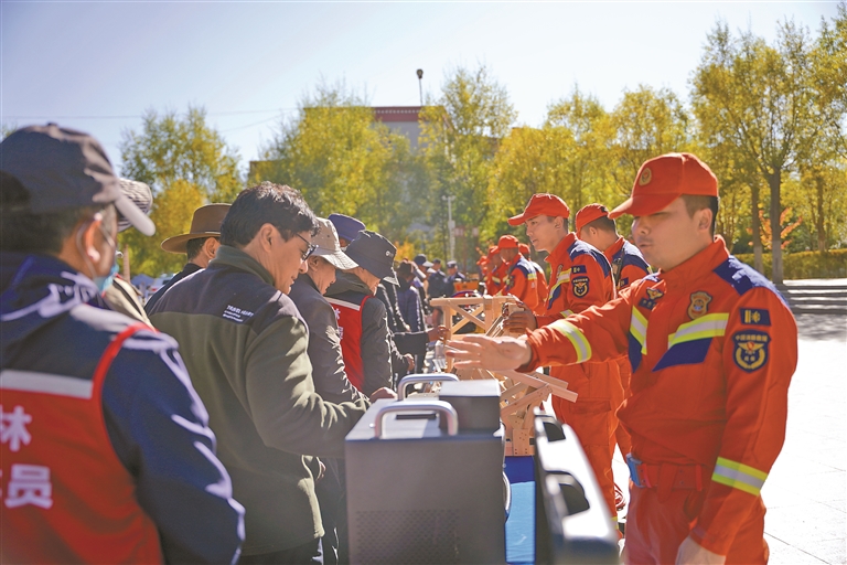 在資料發(fā)放環(huán)節(jié),大隊宣傳員向過往群眾遞發(fā)《森林防火條例》摘要手冊及防災減災科普折頁等宣傳資料200余份,確保防災政策、防火常識廣覆蓋、無遺漏;案例講解環(huán)節(jié),宣傳人員結合周邊近年防災減災典型案例與森林火災真實事件,用漢藏雙語清晰解讀違規(guī)用火、災害應對不當?shù)膰乐睾蠊?,明確違反相關規(guī)定的法律責任,讓群眾直觀感受到防災減災與防火的緊迫性;裝備展示區(qū),專業(yè)救援車輛、滅火器材及救援裝備逐一陳列,大隊宣傳員細致講解各類裝備的用途與操作原理,既充分展現(xiàn)應急救援實力,也有效加深群眾對防災減災、防火救援工作的認知;有獎問答與答疑環(huán)節(jié),通過趣味互動充分激發(fā)群眾參與熱情,針對家庭用火安全、日常防災避險、林區(qū)作業(yè)防火等常見疑問,宣傳員耐心解答、細致指導,做到有問必答、解惑到位。
