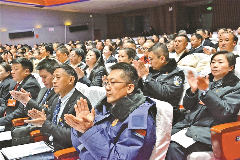 那曲市第二屆人民代表大會第七次會議開幕會上,與會人員在聆聽政府工作報告過程中,不時熱烈鼓掌。記者 汪純 攝