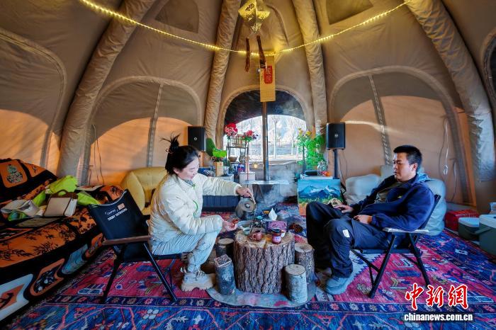 1月26日傍晚,拉薩市中華文化公園露營(yíng)地帳篷內(nèi),黃茜和丈夫一起煮茶聊天。江飛波 攝