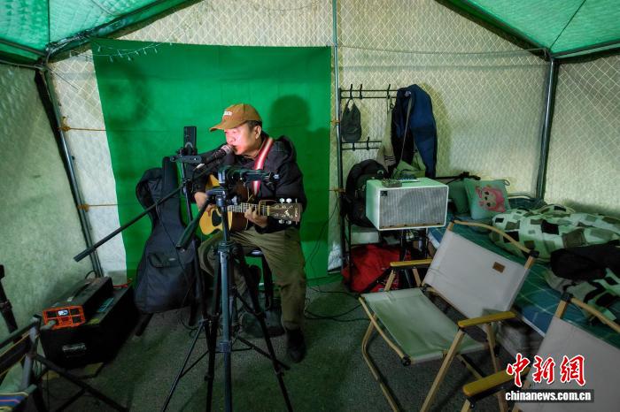 1月26日,拉薩市中華文化公園露營(yíng)地,來自江蘇南京的趙德春在帳篷內(nèi)彈吉他、唱民謠。江飛波 攝