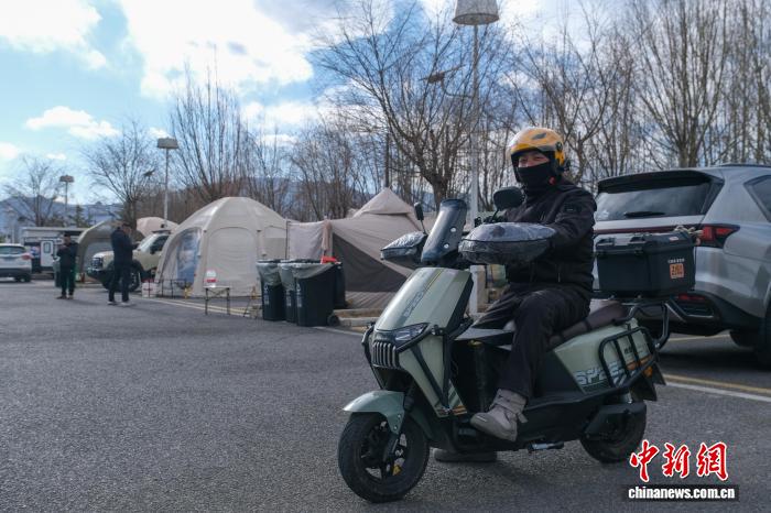 1月25日,拉薩市中華文化公園內(nèi),一位戶外露營(yíng)愛好者準(zhǔn)備出發(fā)去接單送外賣,該營(yíng)地不少人兼職當(dāng)外賣員,以支撐自己的戶外生活。江飛波 攝