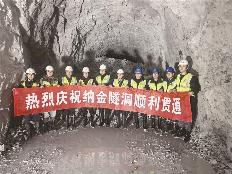 納金隧洞全長5036米,成型斷面為城門洞形,寬3.0米、高3.7米,采用鉆爆法從兩端相向開挖。隧洞穿越中高山地貌,最大埋深約640米,隧洞圍巖以Ⅲ類為主,Ⅳ、Ⅱ類次之。自開工以來,項目團(tuán)隊科學(xué)組織、精細(xì)管理,克服了高海拔隧洞產(chǎn)生的巖爆和集中涌水等惡劣地質(zhì)環(huán)境,嚴(yán)格采取相應(yīng)支護(hù)與封堵措施,連續(xù)5個月單側(cè)工作面月進(jìn)尺超過200米,最高月進(jìn)尺245米。后續(xù)納金隧洞工程將轉(zhuǎn)入隧洞混凝土襯砌施工,項目部將提前謀劃,精心組織,保證施工質(zhì)量與安全,做好轉(zhuǎn)序工作,確保納金隧洞首倉襯砌混凝土按計劃開倉澆筑。
