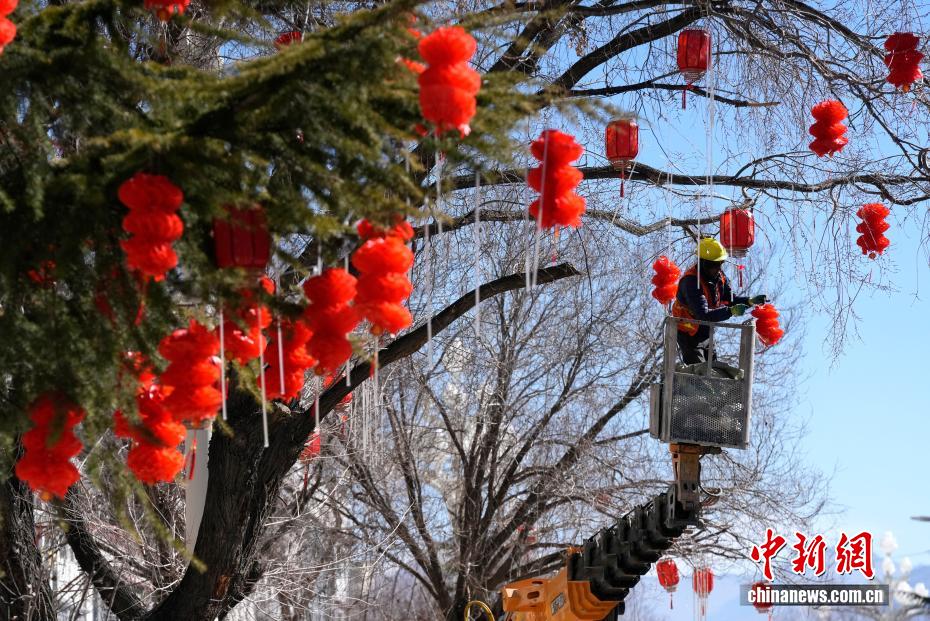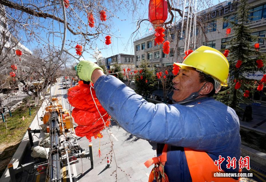 2月3日,西藏拉薩,工人沙吉頓珠正在掛燈籠。隨著春節(jié)、藏歷新年的臨近,拉薩城區(qū)大街小巷被精心裝點,年味愈發(fā)濃郁。中新社記者 李林 攝