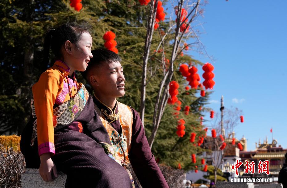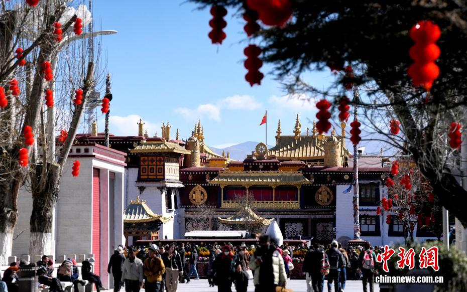 2月3日,西藏拉薩,民眾在大昭寺廣場拍照。隨著春節(jié)、藏歷新年的臨近,拉薩城區(qū)大街小巷被精心裝點,年味愈發(fā)濃郁。中新社記者 李林 攝