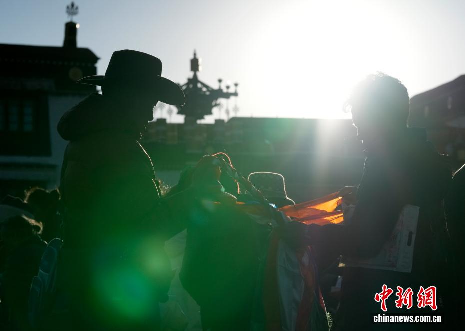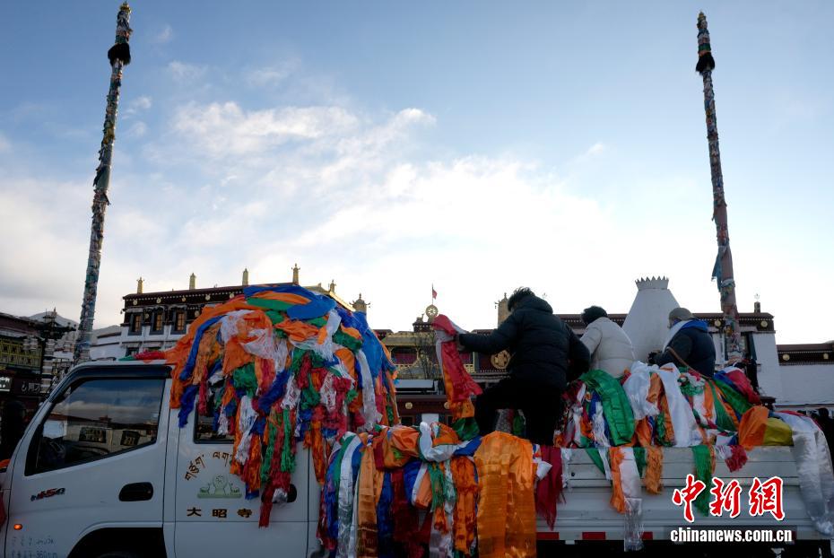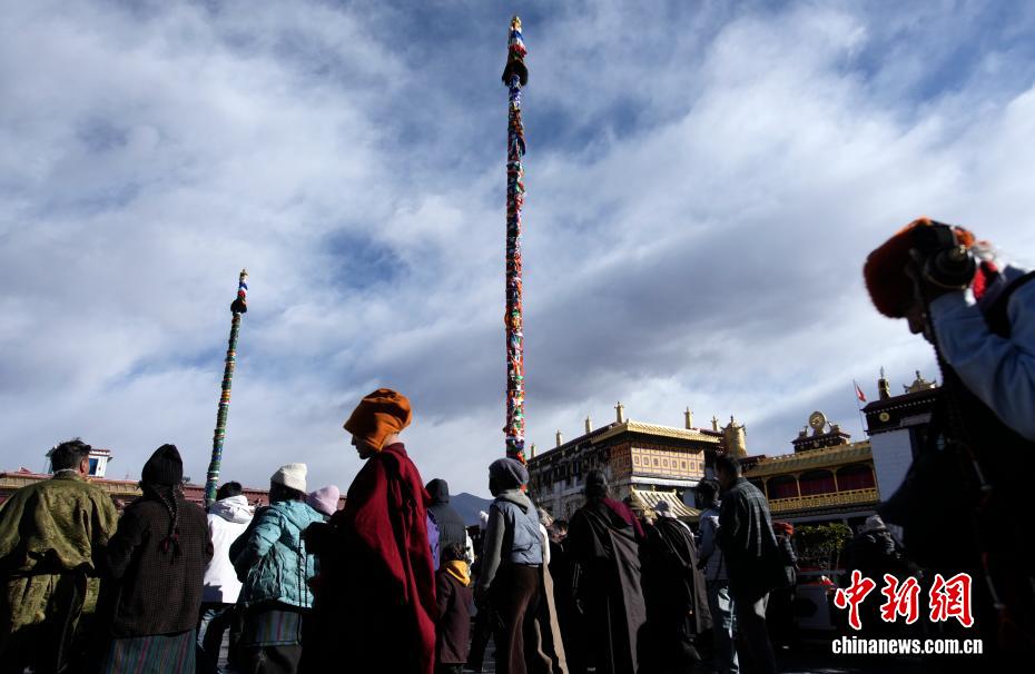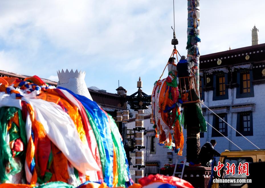 2月5日,西藏拉薩大昭寺的工作人員依據(jù)傳統(tǒng)為大昭寺周邊的5根高20多米的經(jīng)幡柱更換經(jīng)幡,迎接即將到來的藏歷新年。圖為信眾準(zhǔn)備五色哈達敬獻給經(jīng)幡柱。中新社記者 李林 攝