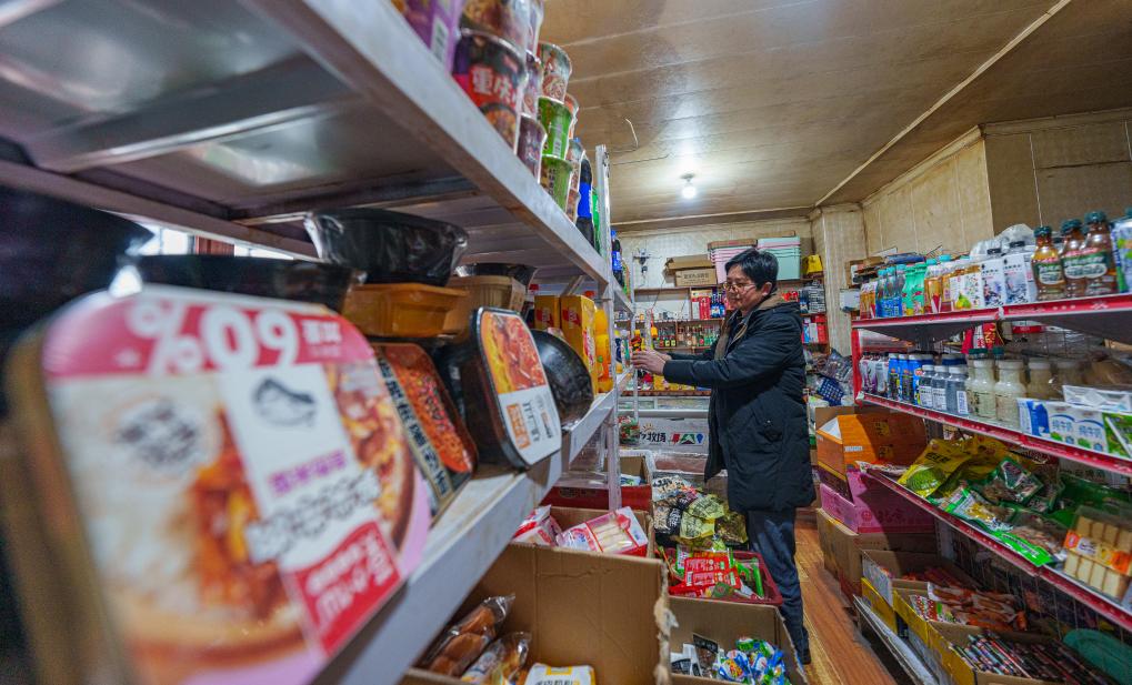 2月5日,玉麥鄉(xiāng)一家超市的老板在整理貨架。新華社記者 丁增尼達 攝