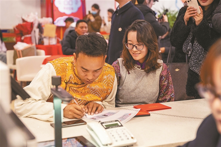 圖為新人在填寫登記所需信息。記者 貢曲羅杰 攝
