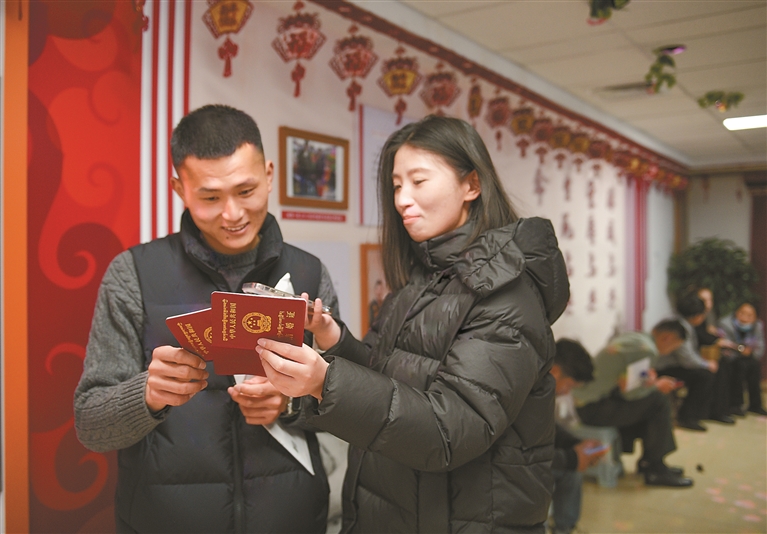 記者在現(xiàn)場看到,婚姻登記處呈現(xiàn)出一派繁忙卻又溫馨的景象:有的情侶在取號機(jī)前井然有序地取號排隊;有的正認(rèn)真填寫登記所需信息;還有的剛領(lǐng)取到結(jié)婚證,手捧紅色證書,或是相互依偎,或是與同行的親朋好友合影留念,笑容中滿是甜蜜與幸福。