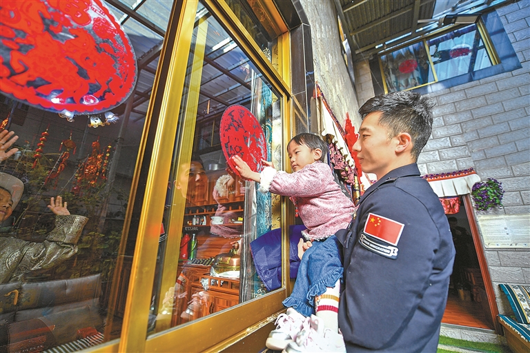 民警抱著普布倉(cāng)決的小孫女貼窗花。旦增嘎瓦 攝