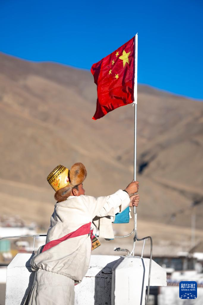 2月16日,長所鄉(xiāng)古榮村村民桑杰將一面嶄新的五星紅旗立在新居屋頂。新華社記者 旦增尼瑪曲珠 攝