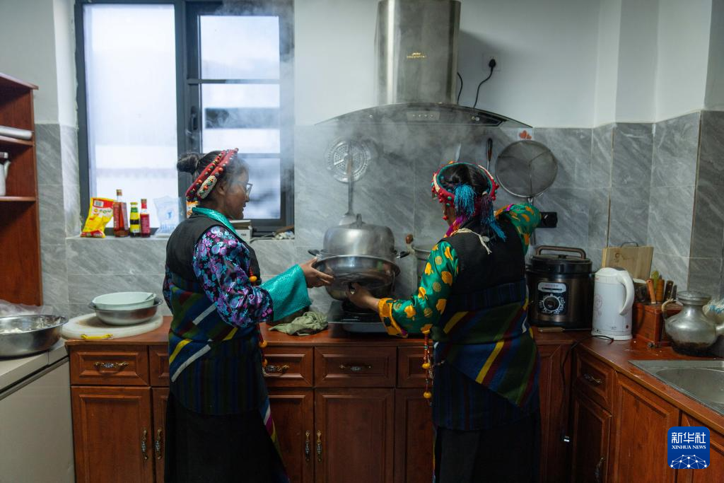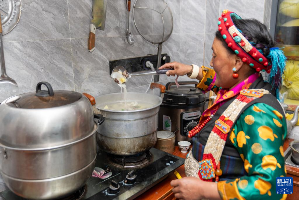 2月16日,長所鄉(xiāng)古榮村村民卓瑪次仁在新居廚房制作年節(jié)食品“古突”。在藏語中,“古”意為“九”,“突”意為“面”,“古突”是一種用牦牛肉湯加入牛肉、蘿卜、奶渣等食材熬煮的面食。按西藏傳統(tǒng)習(xí)俗,“古突”夜,家家戶戶迎來團(tuán)聚,一起享用“古突”。新華社記者 旦增尼瑪曲珠 攝