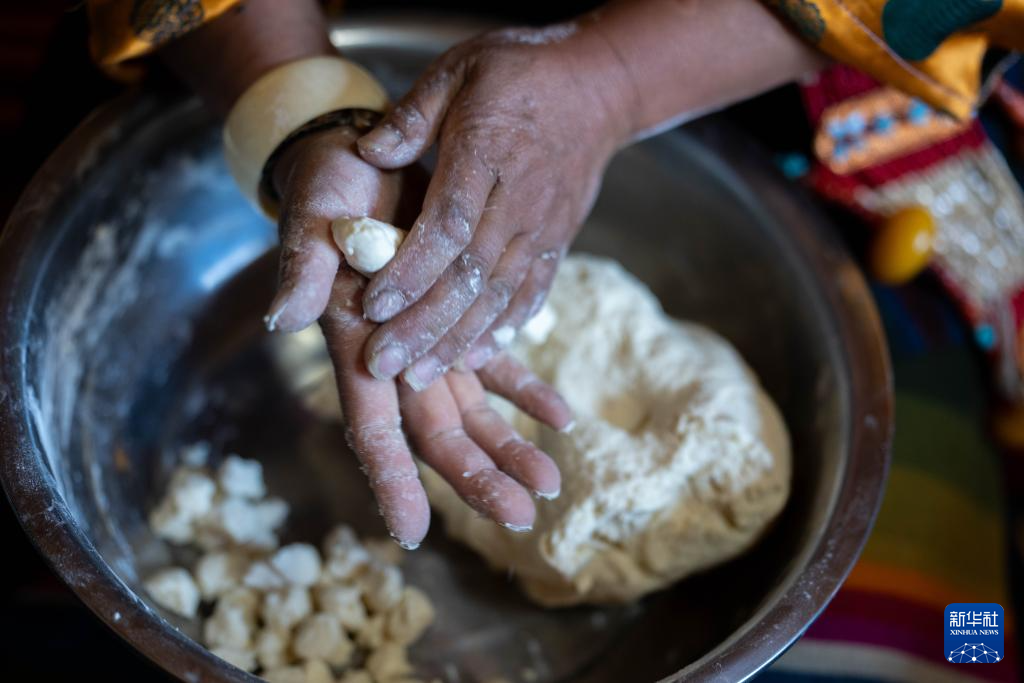 2月16日,長所鄉(xiāng)古榮村村民卓瑪次仁(右)和大女兒旦增旺姆在制作年節(jié)食品“古突”。在藏語中,“古”意為“九”,“突”意為“面”,“古突”是一種用牦牛肉湯加入牛肉、蘿卜、奶渣等食材熬煮的面食。按西藏傳統(tǒng)習(xí)俗,“古突”夜,家家戶戶迎來團(tuán)聚,一起享用“古突”。新華社記者 旦增尼瑪曲珠 攝