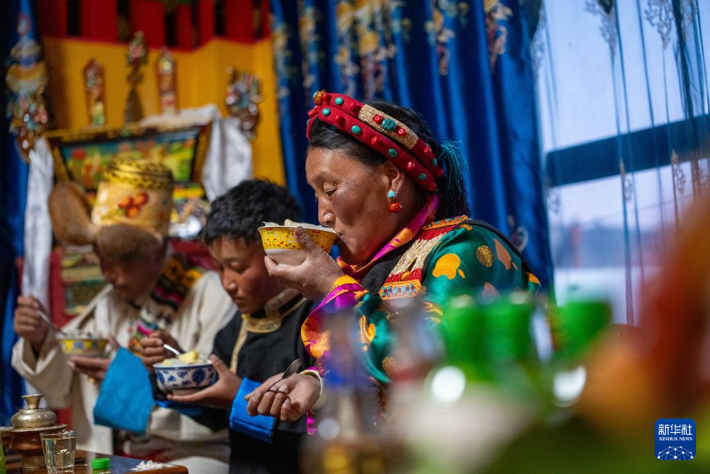 2月16日,長所鄉(xiāng)古榮村村民桑杰(右一)與家人一起吃年節(jié)食品“古突”。在藏語中,“古”意為“九”,“突”意為“面”,“古突”是一種用牦牛肉湯加入牛肉、蘿卜、奶渣等食材熬煮的面食。按西藏傳統(tǒng)習(xí)俗,“古突”夜,家家戶戶迎來團(tuán)聚,一起享用“古突”。新華社記者 旦增尼瑪曲珠 攝