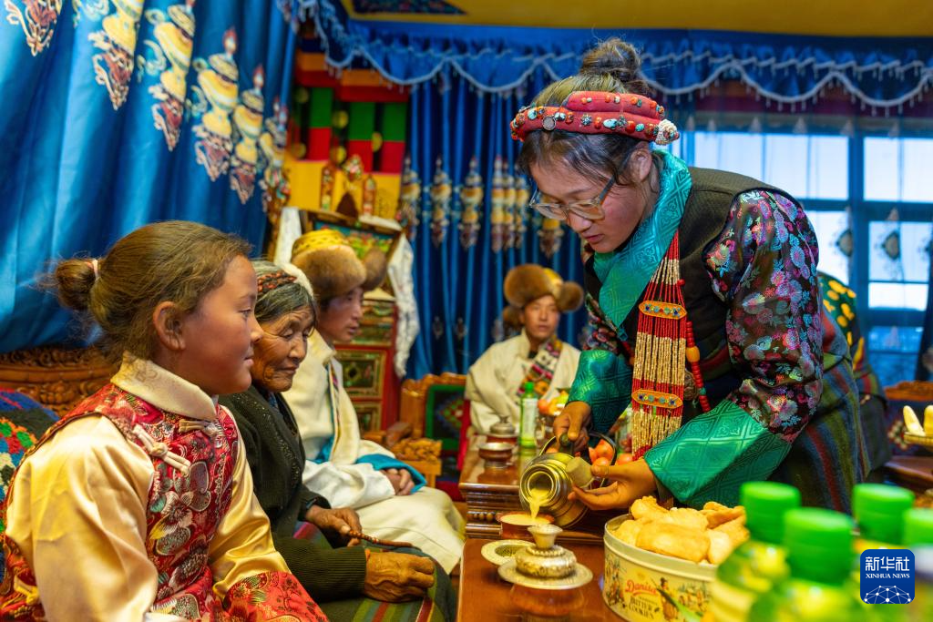 2月16日,長所鄉(xiāng)古榮村村民桑杰的大女兒旦增旺姆(右一)給奶奶次仁塔決倒茶。新華社記者 旦增尼瑪曲珠 攝