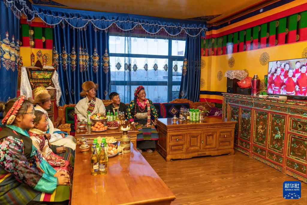 2月16日,長所鄉(xiāng)古榮村村民桑杰一家在新居里觀看春晚。新華社記者 旦增尼瑪曲珠 攝