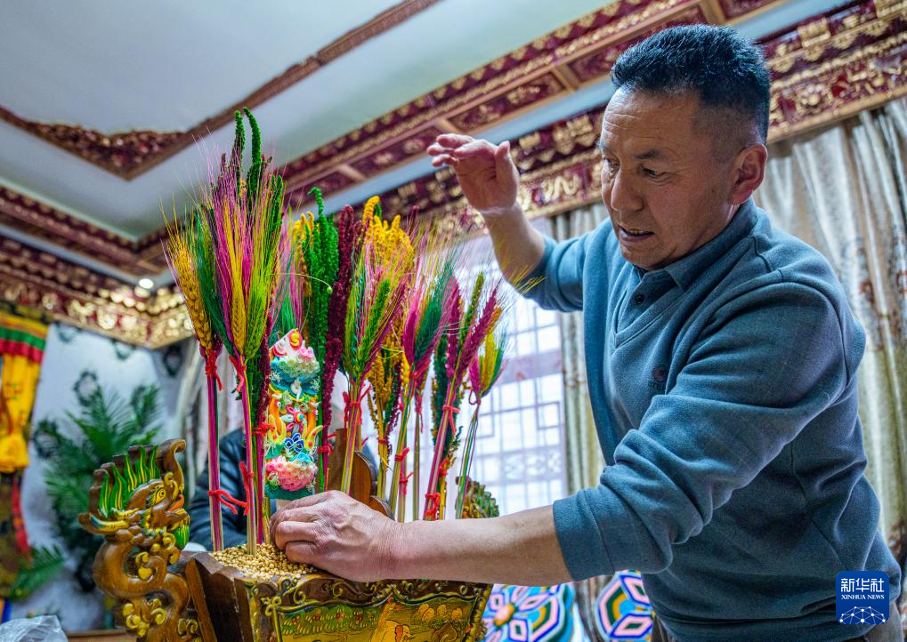 2月16日,在拉薩堆龍德慶區(qū)東嘎街道桑木社區(qū),群群在裝扮切瑪盒(五谷豐登斗)。新華社記者 丁增尼達(dá) 攝