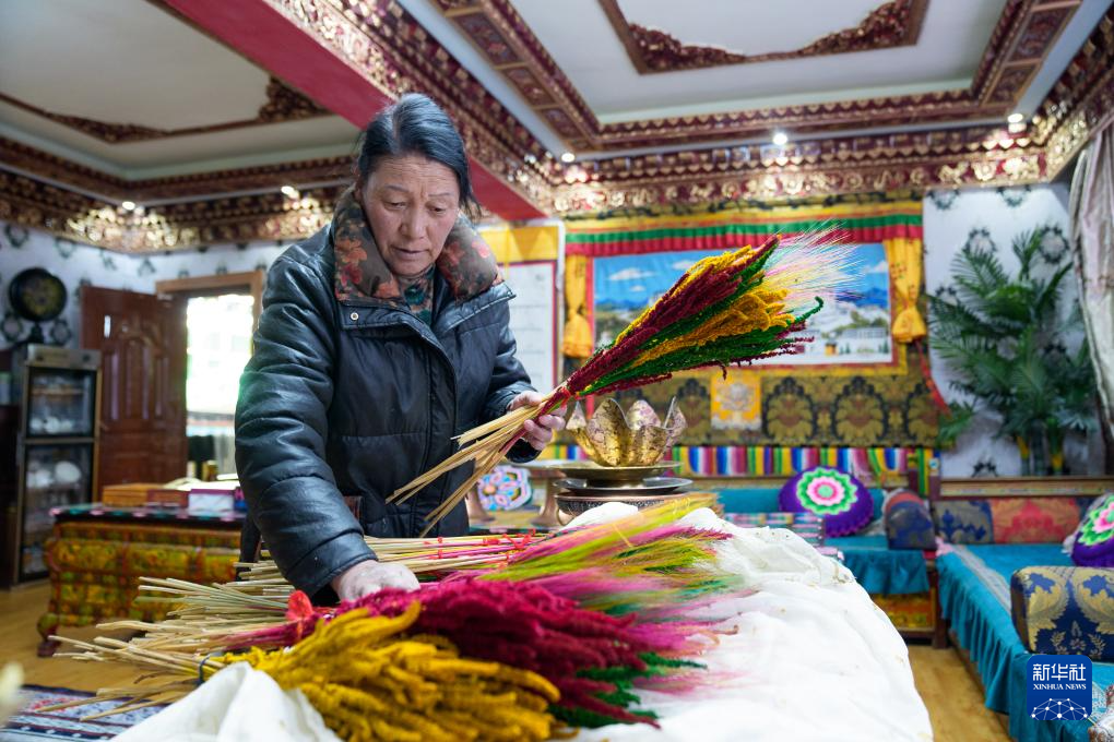2月16日,在拉薩堆龍德慶區(qū)東嘎街道桑木社區(qū),群群的妻子扎桑在整理“羅薩美朵”。新華社記者 丁增尼達(dá) 攝