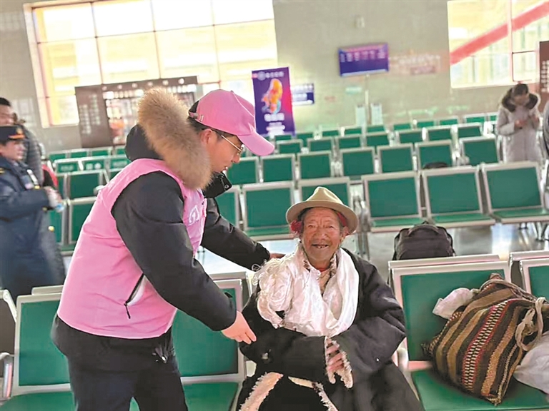 圖為在中國鐵路青藏集團有限公司拉薩車務段日喀則站內,“小花朵青年志愿服務隊”志愿者在為旅客提供服務。記者 鹿麗娟 攝