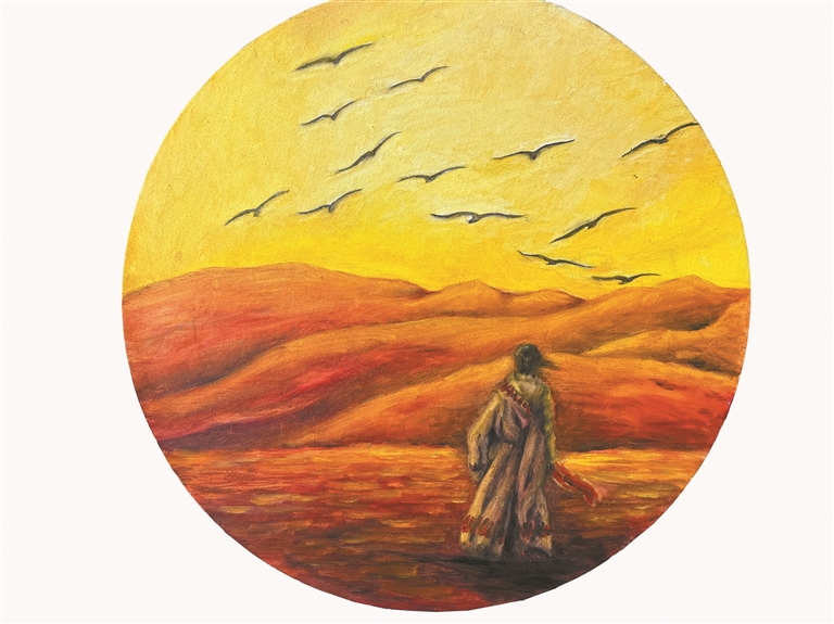 這種融合,在她的作品中綻放出獨(dú)特的光彩。她的作品《在路上》在第二屆“和美西藏”美術(shù)作品大賽上獲優(yōu)秀作品獎(jiǎng)。這幅作品描繪了曲水縣俊巴村漁民勞作的日常詩(shī)篇,畫(huà)面上,夕陽(yáng)將雅魯藏布江染成金紅色,一位漁民背著輕巧的牛皮船,踏著蜿蜒的村道歸家。他的身軀因負(fù)重而微微前傾,腳步卻輕快有力,嘴里似乎還哼唱著漁歌,整個(gè)畫(huà)面流淌著收獲的滿足與歸家的愉悅。