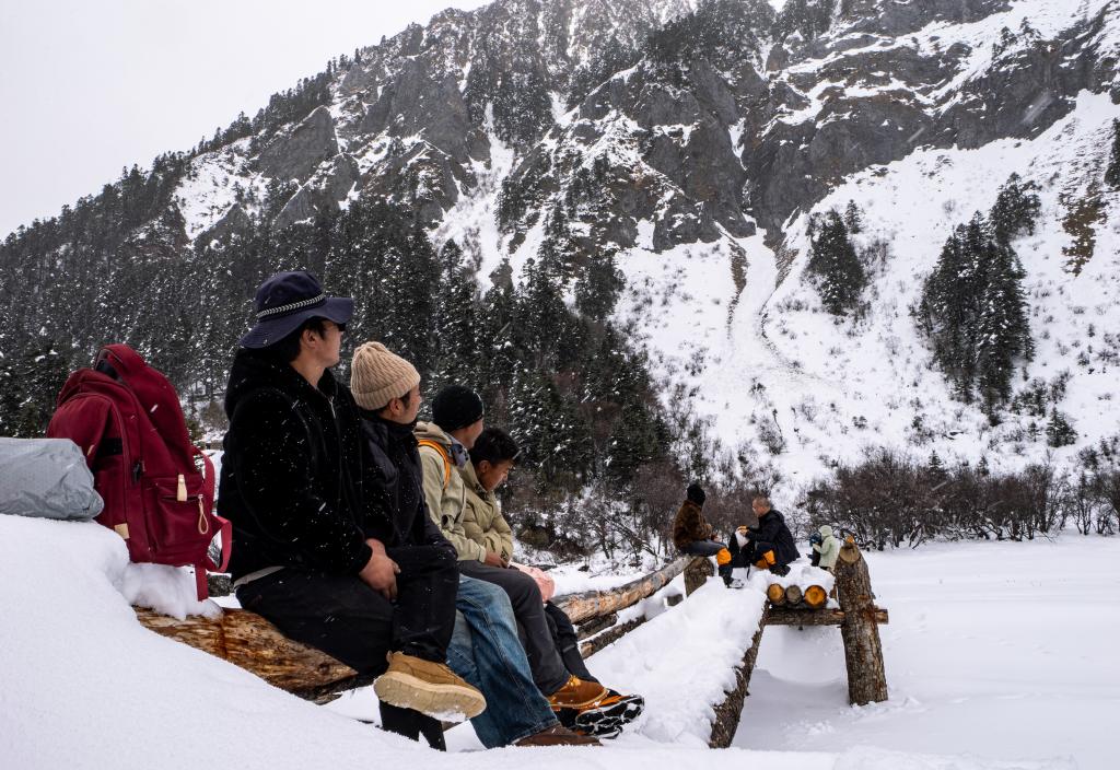 游客們一路走走停停,拍照、駐足、感嘆。因風雪較大,到牧場的2公里路就走了整整一小時。但沒有人放棄,也沒有人覺得遺憾——白普隆溝的美,不在于抵達終點,而在于每一步都有驚喜。