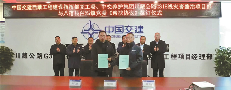 中交養(yǎng)護工程公司G318線災(zāi)害整治項目部與八宿縣白瑪鎮(zhèn)簽訂《幫扶協(xié)議》。記者 王莉 攝