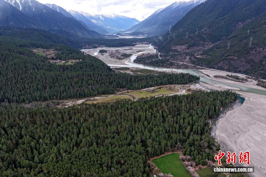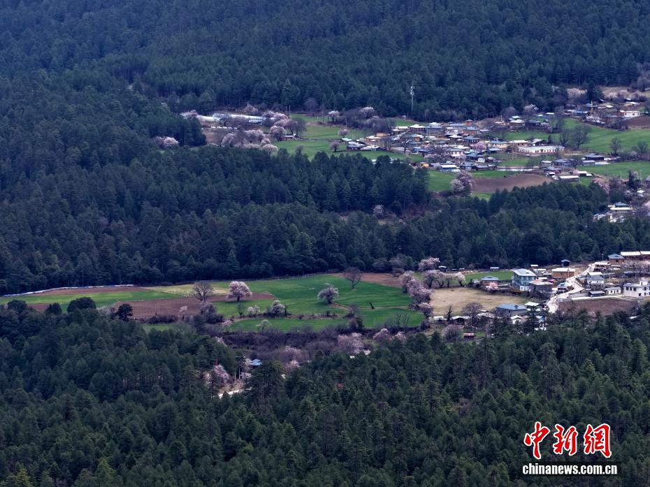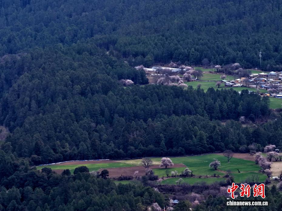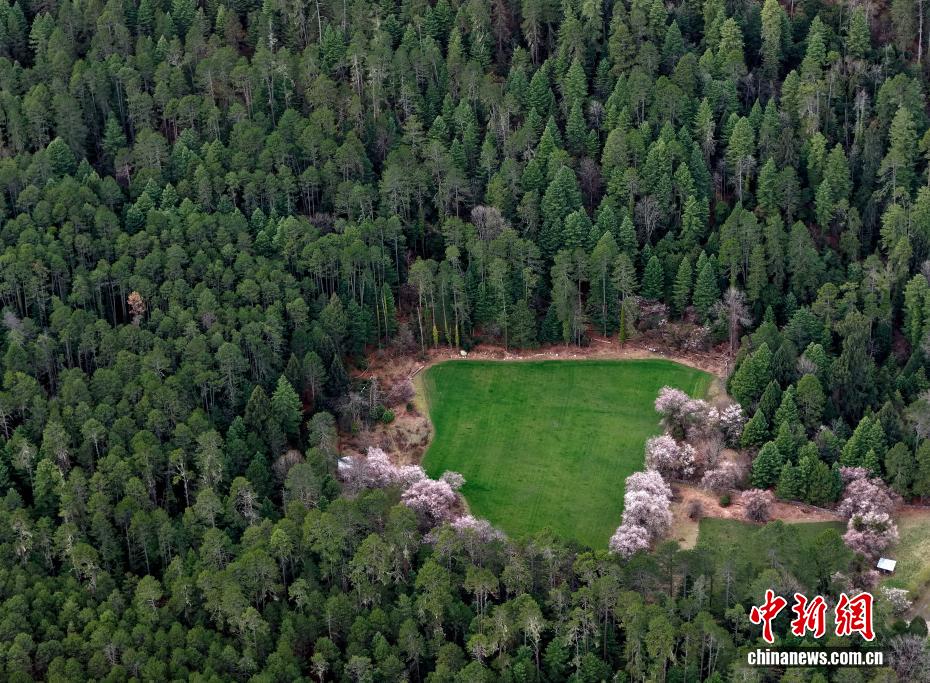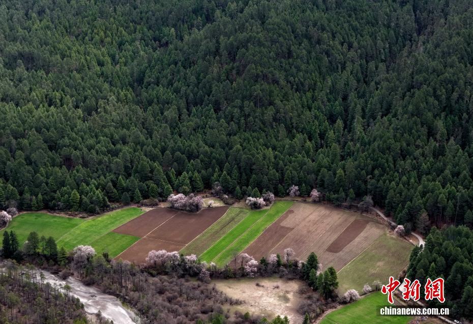 3月26日,西藏波密桃花林海相映成趣。崗云杉林位于西藏林芝市波密縣,森林覆蓋率達61%以上,海拔2700米左右。俯瞰崗云杉林,周邊桃花綻放,與密林、農田構成美麗自然畫卷。(無人機照片)中新社記者 李林 攝