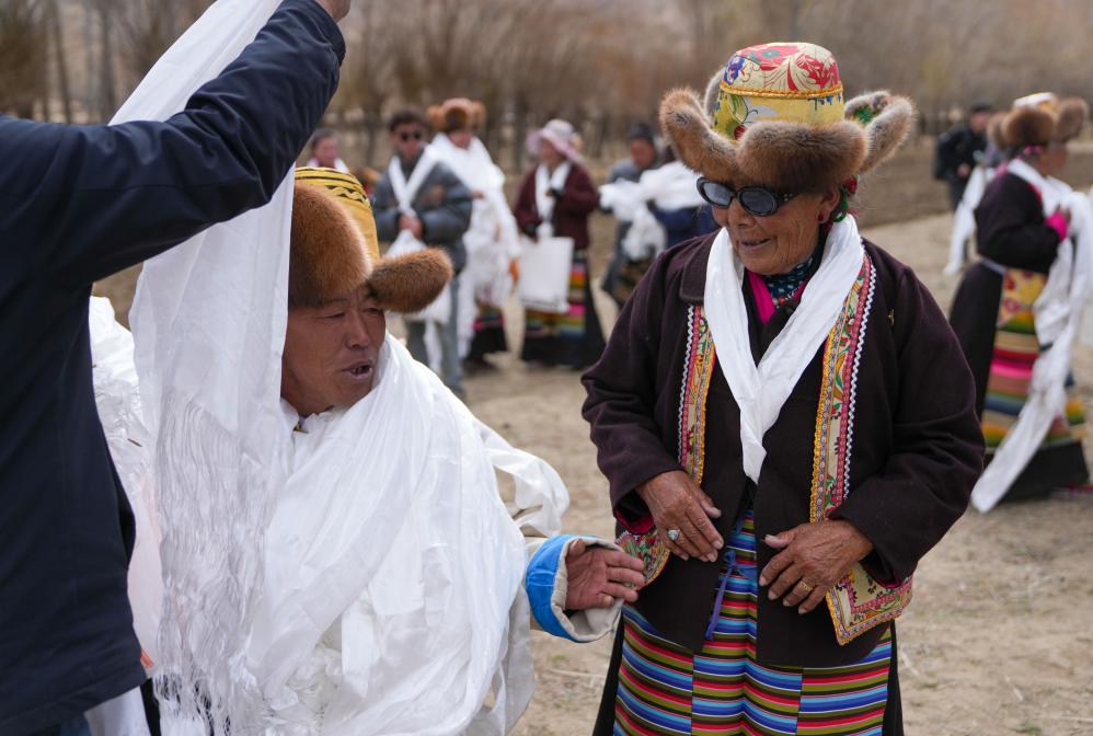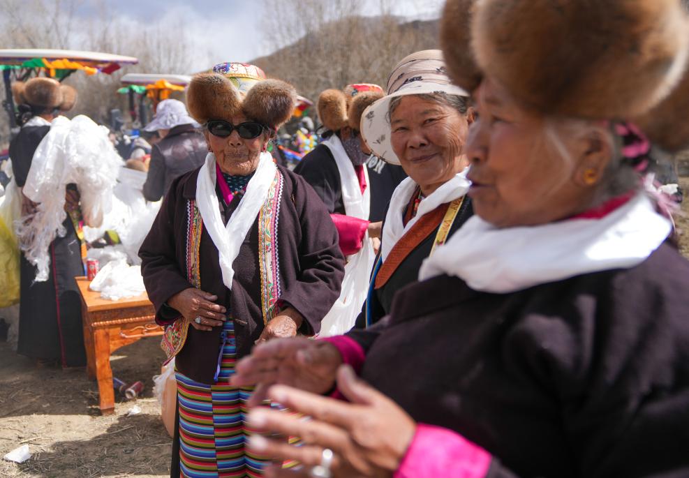 阿旺卓瑪(左)在春耕儀式上和鄉(xiāng)親們攀談(3月16日攝)。