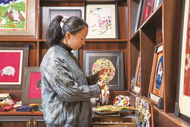早上9點半,羅布的女兒巴桑德吉準時坐在工作臺前,起稿、裁剪、堆貼、繡制……一枚枚精巧雅致的“堆繡”胸針,在她指尖慢慢成型。在日復一日的專注與堅守中,這位年輕傳承人,正用創(chuàng)新與熱愛,讓古老的傳統(tǒng)手藝煥發(fā)新生。