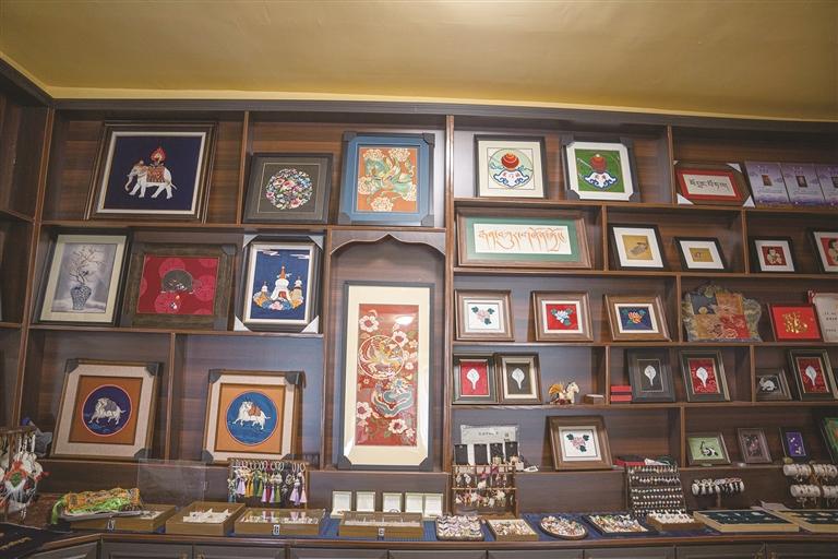 一旁的展示臺上,各類配飾與胸針錯落擺放、琳瑯滿目。東側墻面上,唐卡、服飾與各式文創(chuàng)產品相映成趣。巴桑德吉告訴記者,拉薩“堆繡”唐卡作為國家級非遺項目,以堆、貼、繡、嵌為核心工藝,融合多種刺繡技法,用料考究、工序繁復,是西藏極具代表性的文化瑰寶。為守住技藝的原汁原味,團隊始終堅持純手工制作、不批量生產、不追求速度,實行朝九晚六、無硬性任務的工作模式,杜絕因趕工影響作品質量。憑借扎實手藝與獨特文化內涵,產品深受消費者青睞。