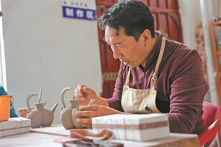 公司實行“按勞計酬”的薪酬制度,為員工提供了穩(wěn)定的收入保障。這份“家門口”的可觀收入,讓員工們穩(wěn)穩(wěn)撐起了家庭的幸福生活?!耙郧霸诩曳N地,收入不穩(wěn)定,現(xiàn)在在公司做黑陶,不僅學到了一門手藝,每個月還有固定工資,日子越過越有盼頭了!”作為曲珠的第一批學生,扎西如今已能獨立設計制作復雜的黑陶茶具,月薪穩(wěn)定在5000元左右,他的感慨道出了所有員工的心聲。這些扎根鄉(xiāng)土的手藝人,不僅用雙手改變了生活,更因?qū)@門技藝的熱愛與堅守,成為察雅黑陶傳承路上的重要力量。