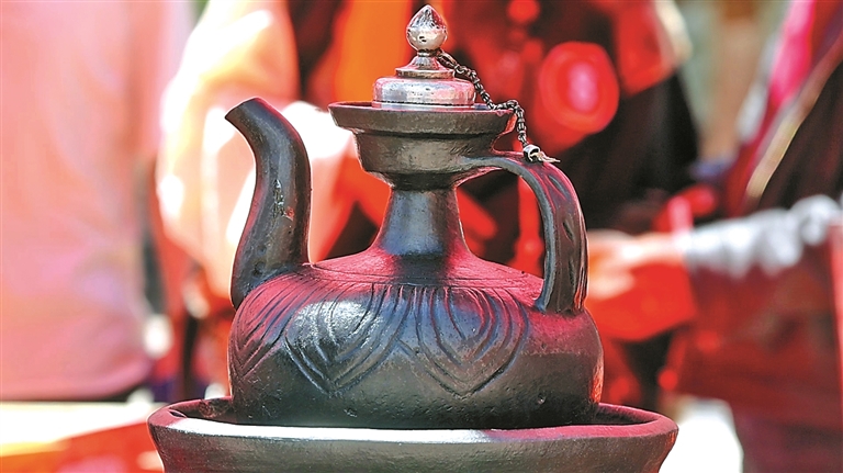 察雅黑陶與其他陶罐的最大區(qū)別除了原材料的選取外,還體現(xiàn)在獨特的制作工藝上。傳統(tǒng)黑陶多為簡約的罐、壺、碗等形制,圖案以簡單的弦紋、水波紋為主,體現(xiàn)了藏族文化中“崇尚自然、簡約質(zhì)樸”的審美?!霸谛聲r代,傳統(tǒng)技藝要想走進年輕人的生活,必須在設計上大膽創(chuàng)新。”曲珠說,為此,他結(jié)合現(xiàn)代生活需求與審美趨勢,對黑陶的外形、圖案進行了大膽改良。