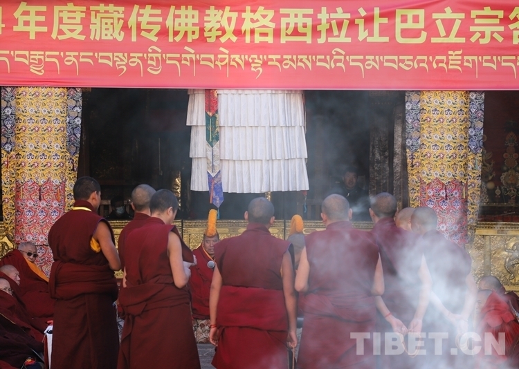 當(dāng)日上午9時(shí),立宗答辯儀式正式開(kāi)始,儀式由藏傳佛教學(xué)經(jīng)僧人考取格西拉讓巴學(xué)位考評(píng)委員會(huì)主持。按照傳統(tǒng)慣例,先舉行無(wú)齋佛事活動(dòng),在考評(píng)委員會(huì)的監(jiān)考下,應(yīng)考格西拉讓巴學(xué)位的12名考僧輪流答辯陪考僧眾所提有關(guān)《釋量論》《般若學(xué)》《中觀(guān)學(xué)》《俱舍論》《戒學(xué)》五部經(jīng)典方面的內(nèi)容。立宗答辯儀式結(jié)束后,所有參加答辯儀式的僧人集體誦經(jīng)祈禱,同時(shí)供齋茶齋飯。齋后,由西藏自治區(qū)宗教局負(fù)責(zé)人代表西藏自治區(qū)政府向參加答辯活動(dòng)的僧人發(fā)放布施。