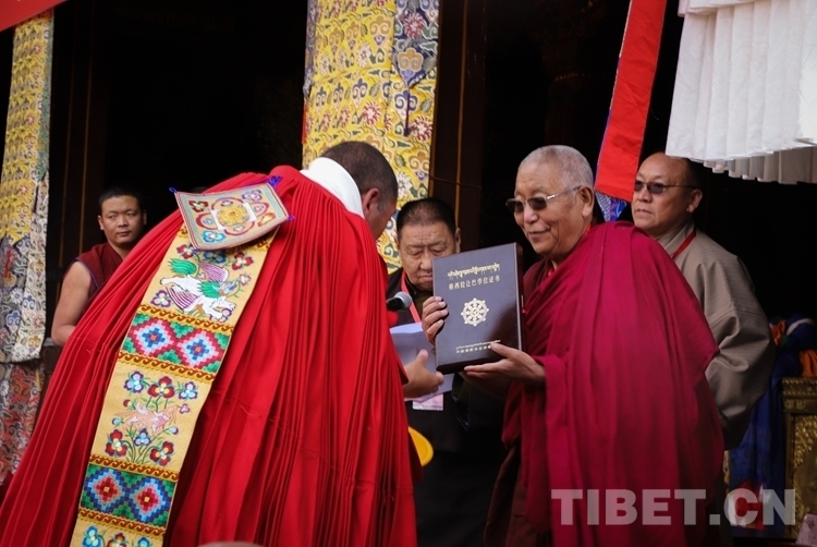 圖為西藏自治區(qū)政府副秘書(shū)長(zhǎng)高寶軍向獲得學(xué)位的考僧贈(zèng)送五彩緞、干果、袈裟 攝影:賈華加