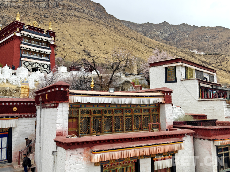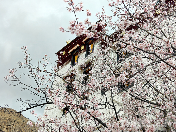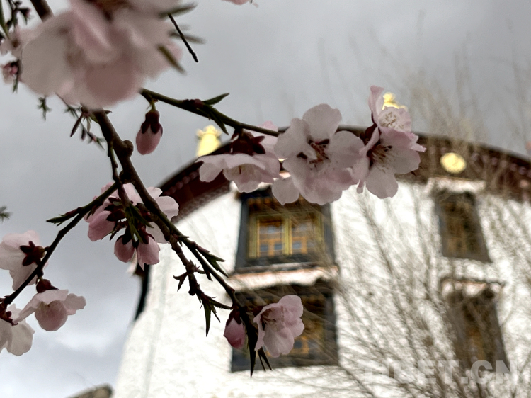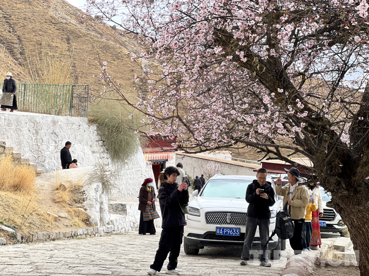 圖為帕邦喀古建筑與桃樹(shù)同框的畫(huà)面