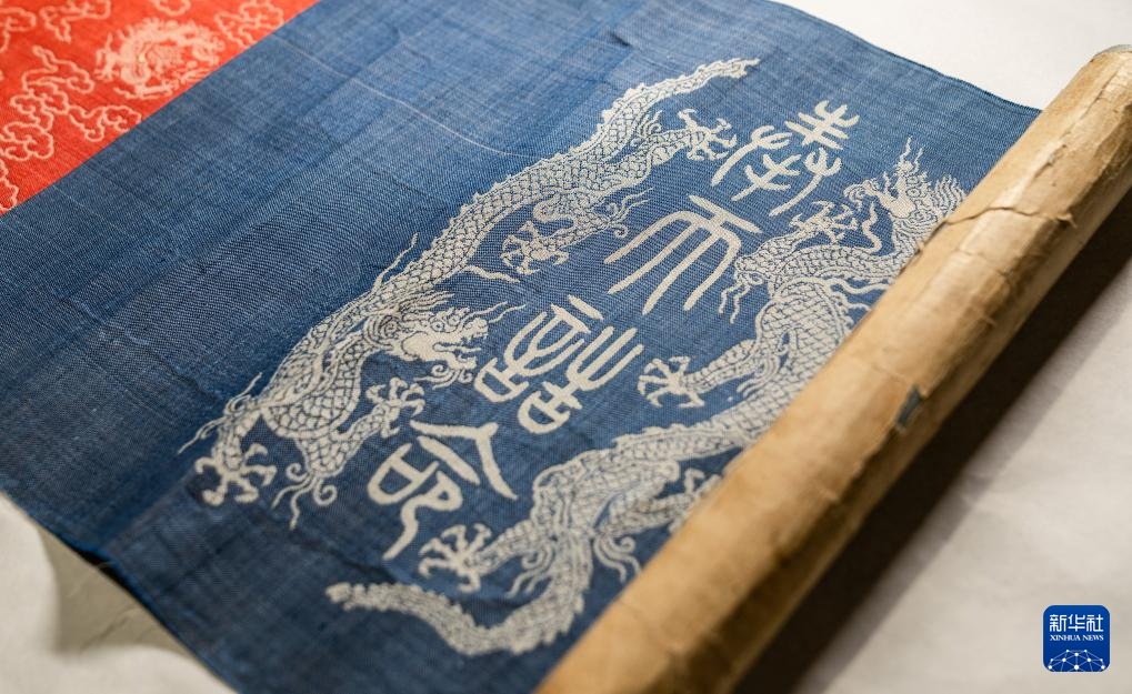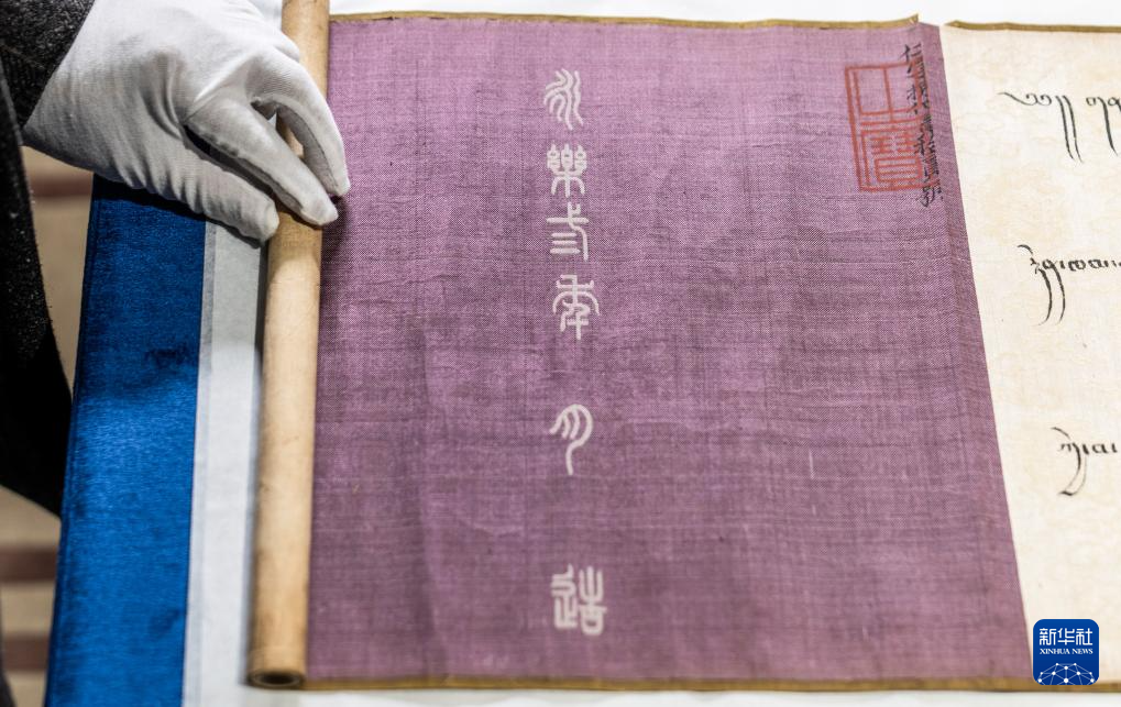 ?這是《永樂十一年封斡喃渴烈思巴為輔教王誥書》卷首(5月20日攝)。篆書“奉天誥命”四個(gè)字和雙龍圖案均是錦緞織造時(shí)應(yīng)用提花技術(shù)以不同色彩的絲線織成。新華社記者 李賀 攝