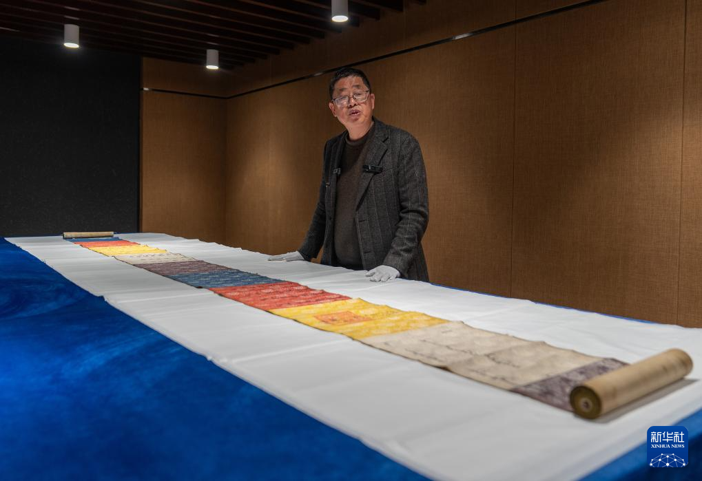 西藏博物館工作人員將《永樂十一年封斡喃渴烈思巴為輔教王誥書》徐徐展開(5月20日攝)。新華社記者 旦增尼瑪曲珠 攝 ??