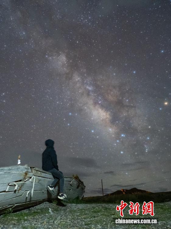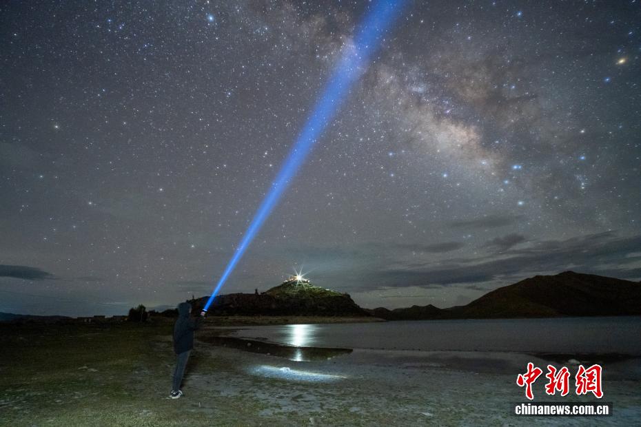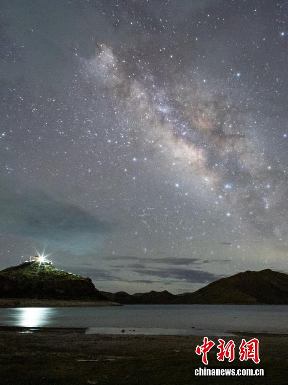 西藏山南羊卓雍錯(cuò)日托寺,因?yàn)楹0胃?、遠(yuǎn)離城市光污染,是理想的觀星之地。近日,海拔4400多米的寺廟夜空清澈,銀河清晰可見(jiàn),璀璨星辰與羊卓雍錯(cuò)相映成趣,吸引游客和攝影愛(ài)好者觀星拍攝。圖為游客在羊卓雍錯(cuò)日托寺附近與銀河“打卡”。江飛波 攝
