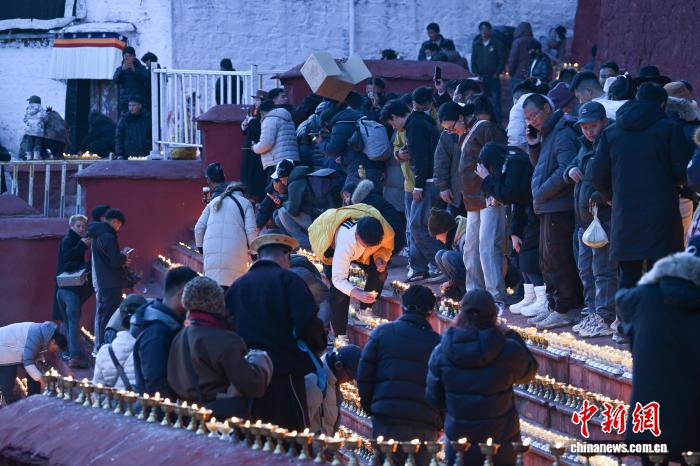 12月14日即藏歷十月二十五日,是藏傳佛教格魯派燃燈日。在西藏拉薩市的藏傳佛教格魯派祖寺甘丹寺內(nèi),信眾點(diǎn)燃酥油燈,祈福平安吉祥?!叭紵羧铡笔羌o(jì)念藏傳佛教格魯派創(chuàng)始人宗喀巴大師圓寂而舉行的活動(dòng),已有600多年歷史。圖為信眾在甘丹寺內(nèi)點(diǎn)酥油燈。 中新社記者 貢嘎來松 攝